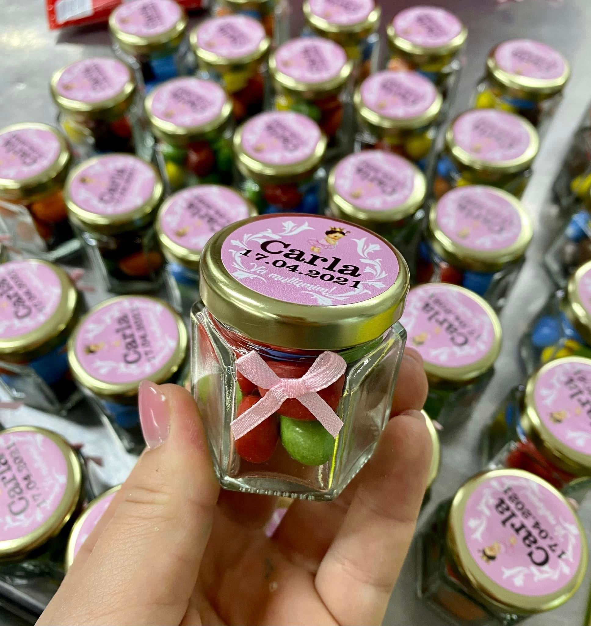 Un cadou dulce și plin de culoare, format dintr-un borcănel elegant umplut cu bomboane delicioase cu alune îmbrăcate în ciocolată, atent ambalate și completate cu etichetă personalizată, realizată în funcție de tema evenimentului. O mărturie veselă și apreciată, perfectă pentru a aduce un plus de bucurie invitaților.